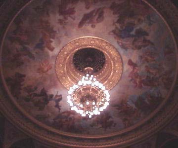 <歌劇場内天井にあるシャンデリアとフレスコ画>